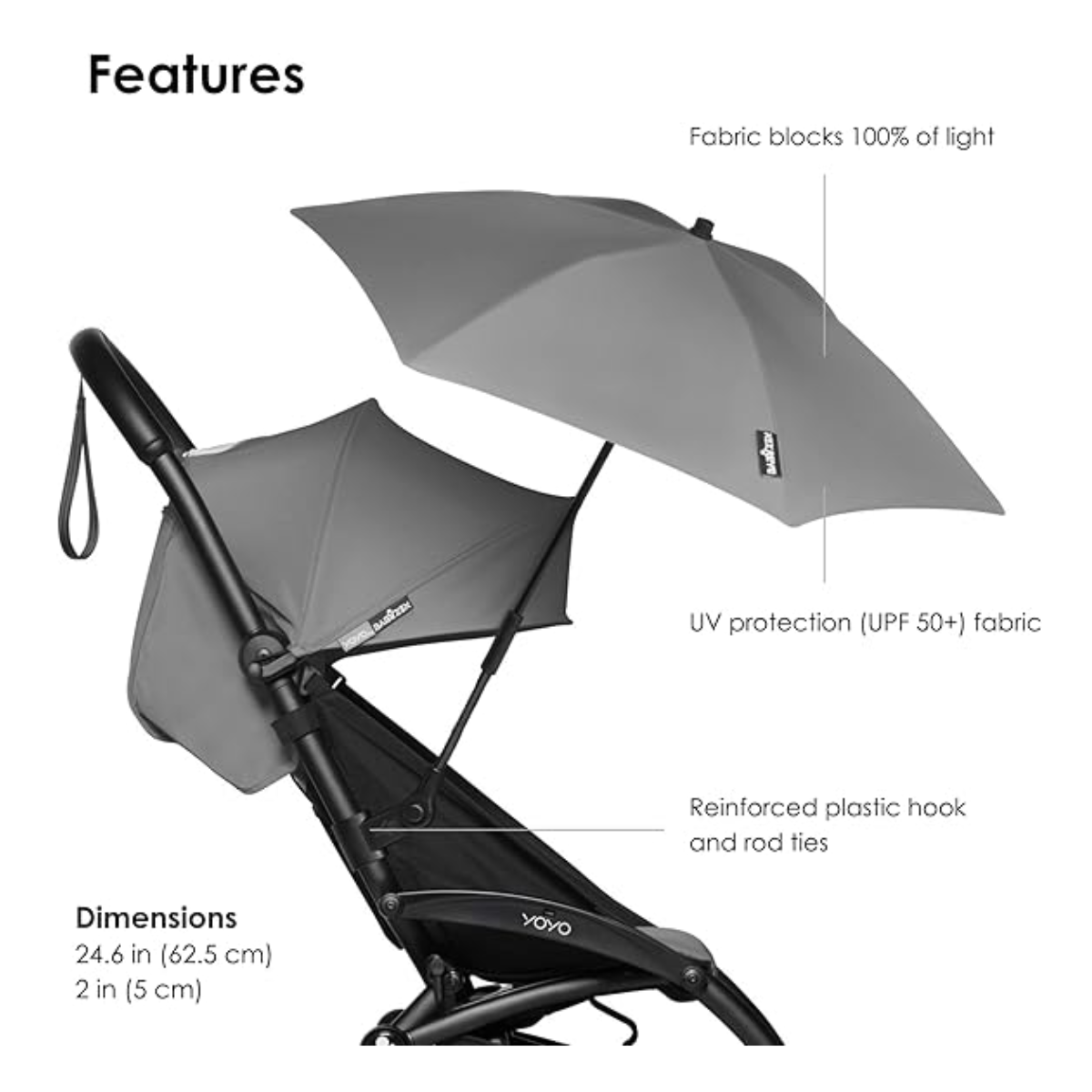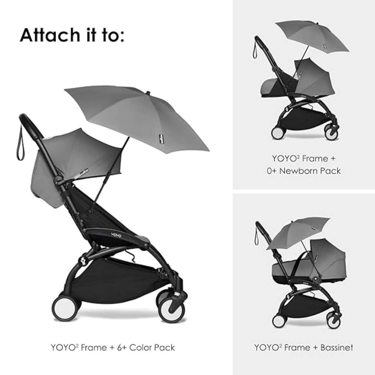 Este Parasol Yoyo+ Babyzen Grey se conecta facilmente às armações dos carrinhos Babyzen YOYO + ZEN para oferecer sombra instantânea para o bebê.