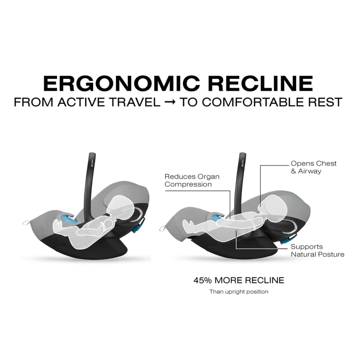 Ergonomic Recline Comfort Provides a 45% flatter recline to reduce organ compression and promote natural breathing and posture from birth. |