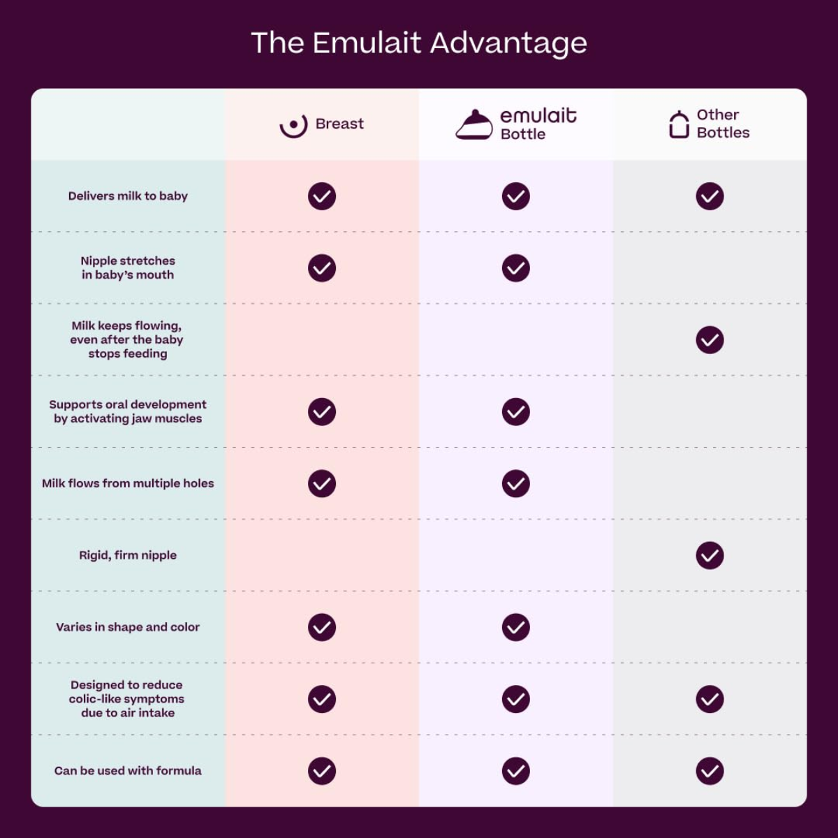 Designed as a first-of-its-kind biomimetic feeding system, Emulait bottles are crafted to emulate a natural baby-to-breast feeding position. This thoughtful design promotes better eye contact, supports responsive feeding, and helps maintain the bonding experience between parent and baby.