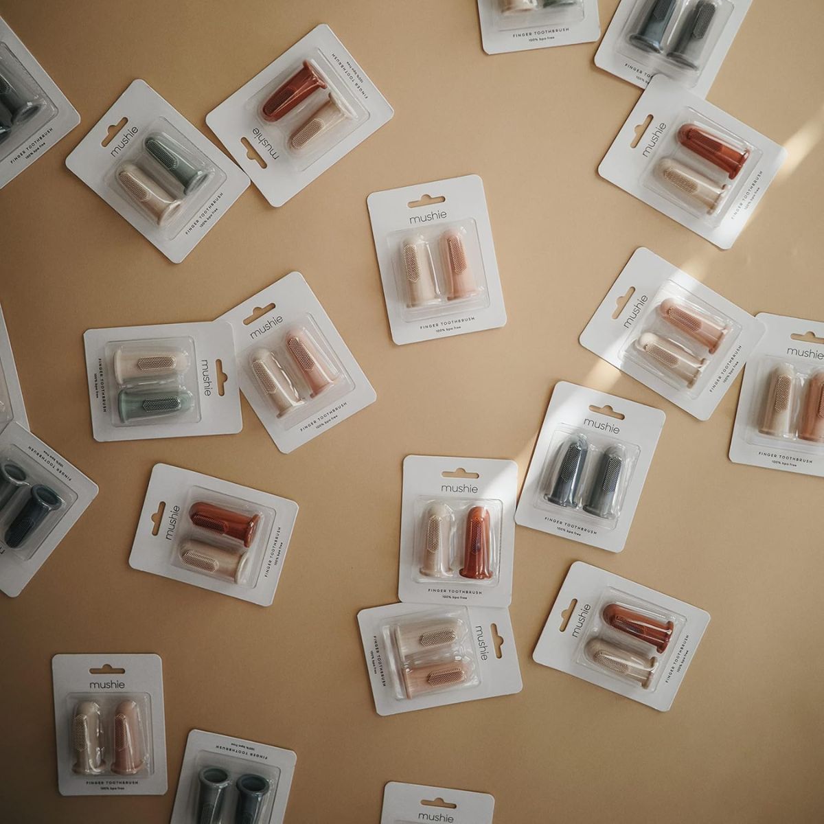 Ajude seu filho a escovar os dentes e a criar bons hábitos de higiene com o Kit de Escovas Dededeiras Mushie Blush/Shifting Sand