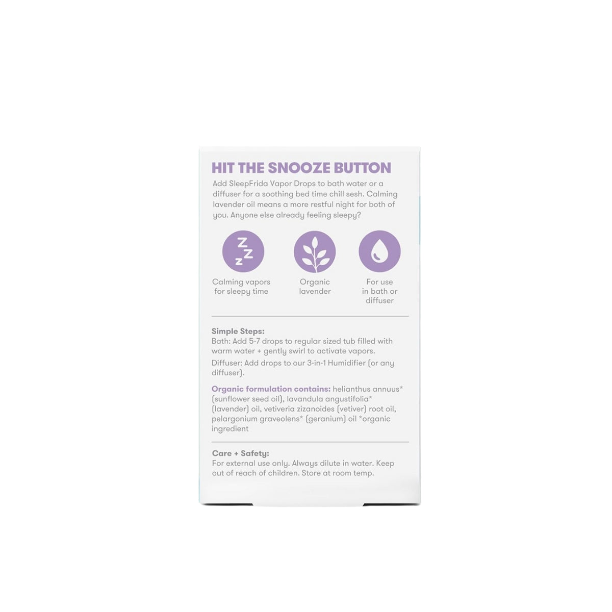 Aperte o botão soneca. Adicione BreatheFrida ™ Vapor Drops à água do banho ou a um difusor para uma sessão relaxante na hora de dormir. Óleo de lavanda calmante significa uma noite mais tranquila para vocês dois. Simplesmente coloque na água morna do banho ou coloque algumas gotas em um difusor.