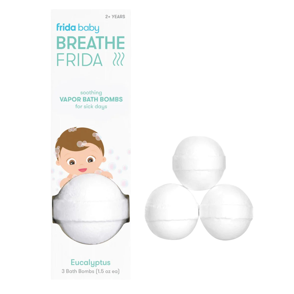 Quando as vias respiratórias do seu filho estiverem mais congestionadas do que o aeroporto no Dia de Ação de Graças, jogue uma Bomba de Banho Vapor BreatheFrida na banheira e inspire aromas relaxantes! Com óleos de eucalipto e lavanda, nossas Bombas de Banho Vapor ajudarão você a superar a temporada de gripes e resfriados. E, olha só, elas também funcionam para adultos!