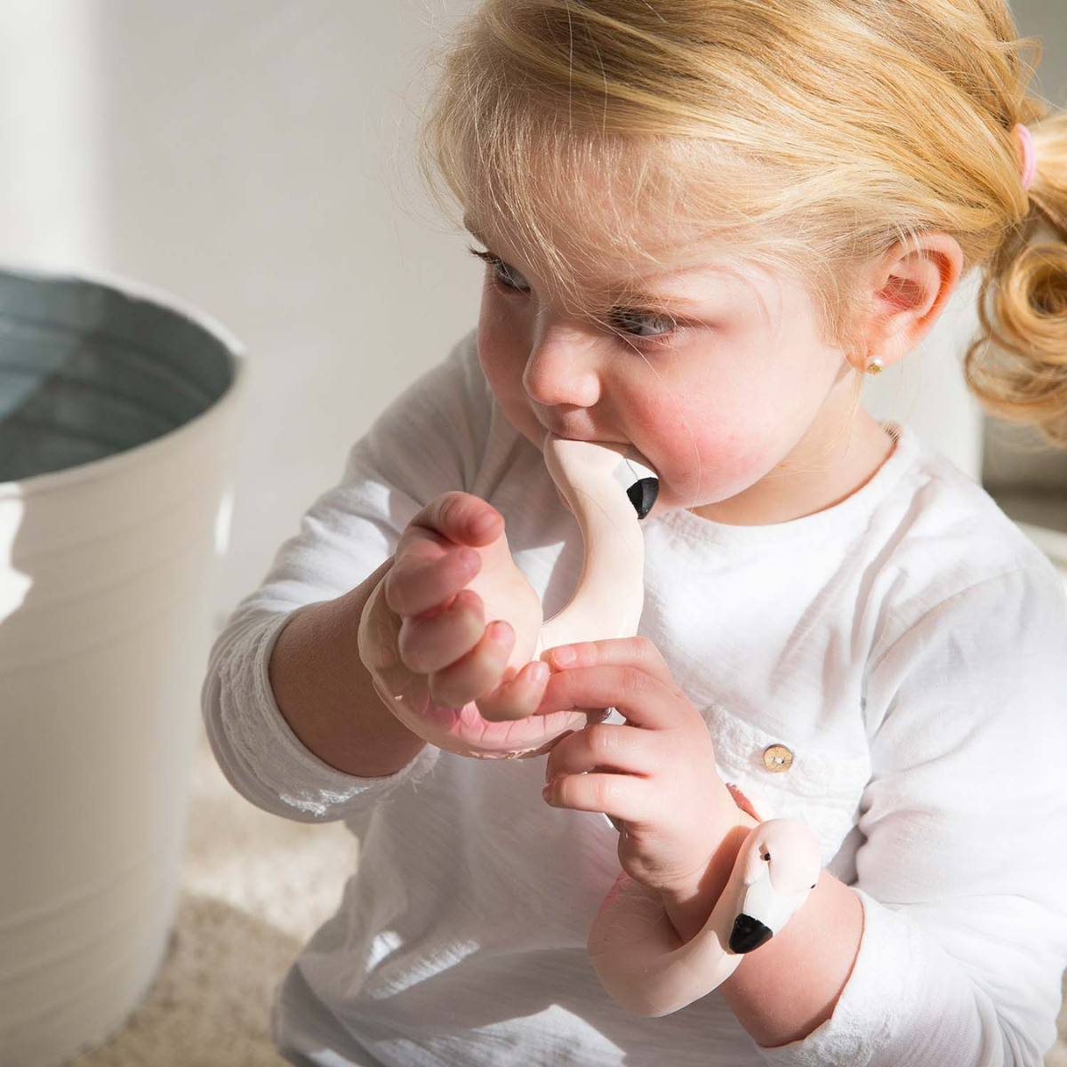 Sky the Flamingo is an animal-shaped baby teether bracelet designed for teething relief and sensory play. Soft, flexible, and easy to place around your baby’s wrist, it allows little ones to chew comfortably throughout the day while stimulating their senses in a safe and natural way.