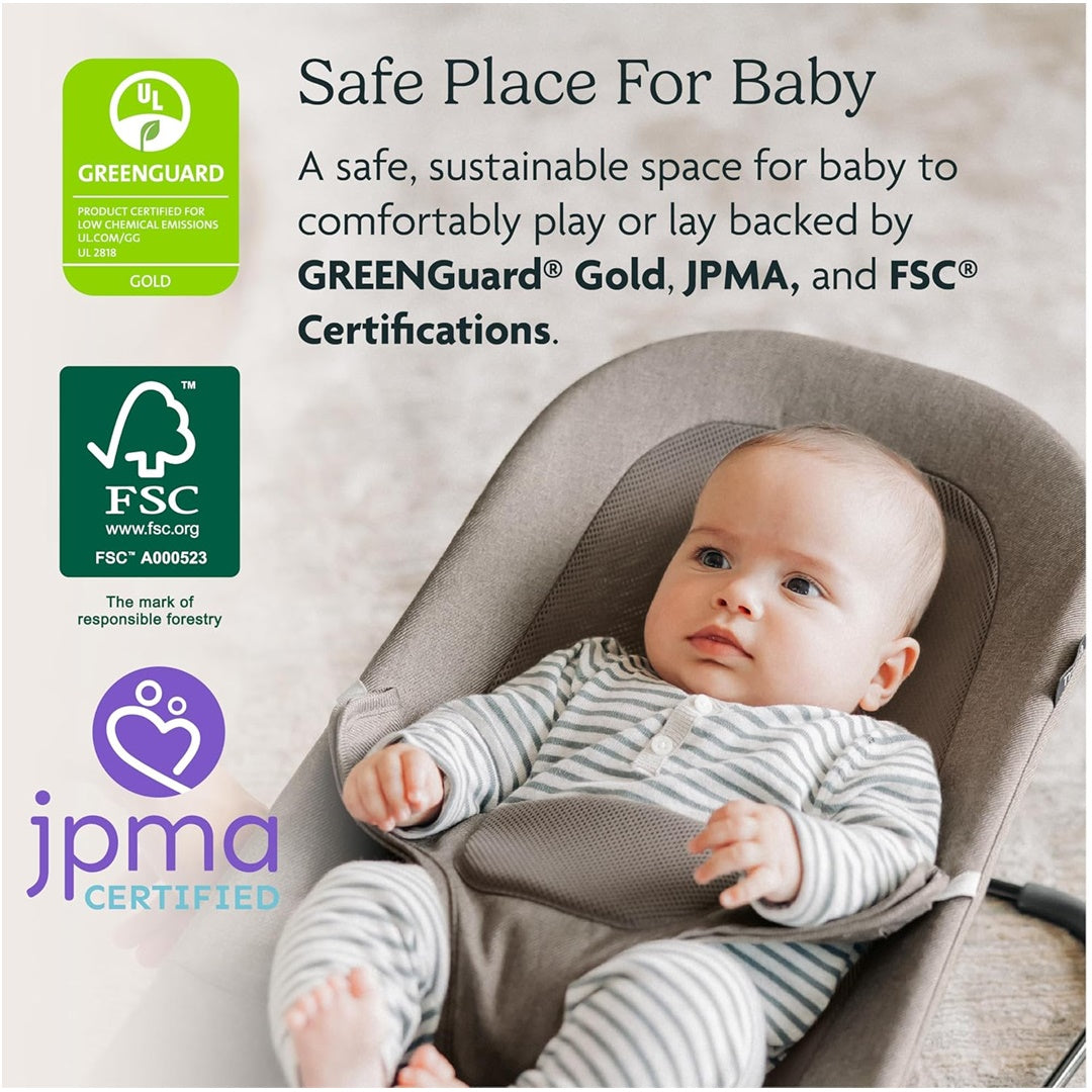 Um espaço seguro e sustentável para o bebê brincar ou deitar confortavelmente, apoiado pelas certificações GREENGUARD® Gold, JPMA e FSC, o que significa que o Mira passou por testes rigorosos que garantem um padrão mais elevado de segurança do produto.