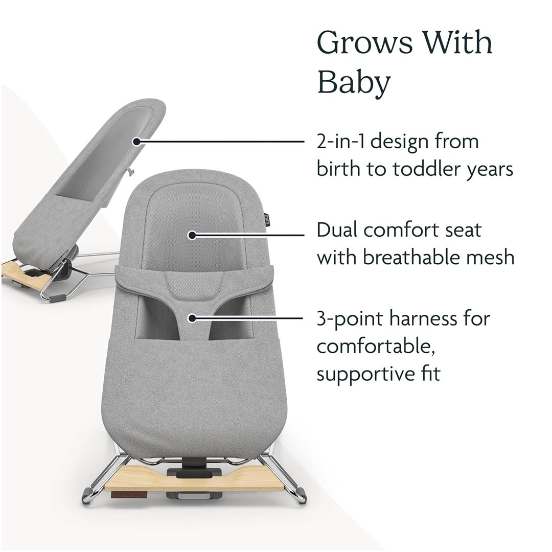 Um lugar aconchegante para brincar ou deitar, o Bouncer Mira Uppababy foi pensado para acalmar e confortar o bebê, mantendo-o por perto. Seguindo o seu movimento natural, a espreguiçadeira e o assento 2 em 1 balançam suavemente ao ritmo do recém-nascido até à criança.